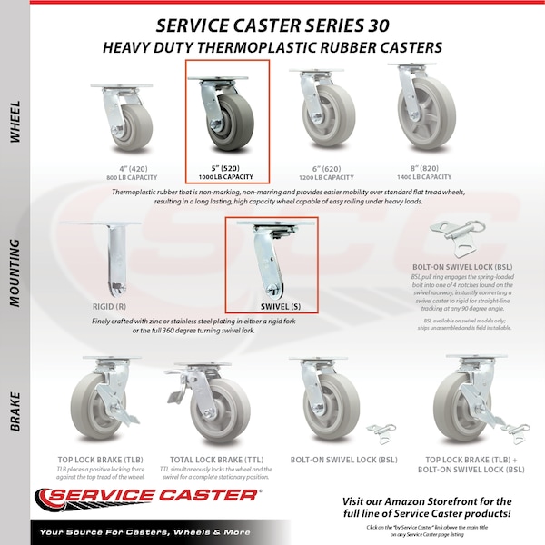Listing is for one (1) Service Caster Series #30 swivel caster with a 5" diameter, 2" wide thermoplastic rubber tread on polyolefin core wheel and maintenance free precision ball wheel bearings. Supports 350 pounds (lbs) per caster. When searching for a reliable and durable solution for medium and heavy duty projects, consider Service Caster’s Series 30 top plate thermoplastic rubber flat tread on polyolefin core casters. The soft flat tread is made of thermoplastic rubber that is non-marking and non-marring, and on the polyolefin core provides a long lasting, high capacity wheel that is capable of easy rolling under heavy loads. Finely crafted with double ball bearing heat treated raceways, these versatile casters are ideal for a wide range of applications, such as dollies, platform trucks, warehouse carts and freight terminals. Or ensure a smooth and secure ride for food service carts, hotel housekeeping carts, and industrial and commercial equipment. Even drywall carts, welding carts, and wall panel carts will be ready to roll on the Series 30, keeping you moving forward. Service Caster is unsurpassed in quality, reliability, and excellent customer service. Count on us to move you forward.