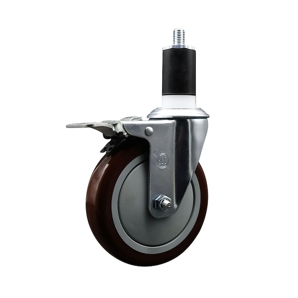 Listing is for one 1 Service Caster Series #20 1-1/2'' expanding stem swivel caster with a 5'' diameter by 1-1/4'' wide maroon polyurethane wheel and a total locking brake capable of supporting 350 lbs./caster. When searching for a reliable and durable solution to your caster needs, look no further than the Service Caster Series 20 expanding stem maroon polyurethane wheel casters. The Series #20 features an innovative expanding stem that can easily adapt to the inside diameter of the opening, allowing for a secure fit in round or square tubes. Simply tighten the topmost knurled nut to compress the rubber for a snug fit. For added security, further compress the rubber with a wrench via the nut under the swivel raceway. Finely crafted with a bright zinc plated finish, heat-treated ball bearing raceway, and a maroon polyurethane wheel, this versatile caster is ideal for work tables, shop projects, or any equipment with round or square tube legs. Service Caster is unsurpassed in quality, reliability, and excellent customer service. Count on us to move you forward.