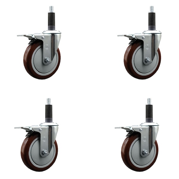 Listing is for a set of four 4 Service Caster Series #20 1'' expanding stem swivel casters with 5'' diameter by 1-1/4'' wide maroon polyurethane wheels and total locking brakes capable of supporting a total weight of 1,400 lbs. 350 lbs./caster.. When searching for a reliable and durable solution to your caster needs, look no further than the Service Caster Series 20 expanding stem maroon polyurethane wheel casters. The Series #20 features an innovative expanding stem that can easily adapt to the inside diameter of the opening, allowing for a secure fit in round or square tubes. Simply tighten the topmost knurled nut to compress the rubber for a snug fit. For added security, further compress the rubber with a wrench via the nut under the swivel raceway. Finely crafted with a bright zinc plated finish, heat-treated ball bearing raceway, and a maroon polyurethane wheel, this versatile caster is ideal for work tables, shop projects, or any equipment with round or square tube legs. Service Caster is unsurpassed in quality, reliability, and excellent customer service. Count on us to move you forward.