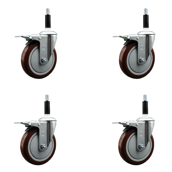 Listing is for a set of four 4 Service Caster Series #20 7/8'' expanding stem swivel casters with 5'' diameter by 1-1/4'' wide maroon polyurethane wheels and total locking brakes capable of supporting a total weight of 1,400 lbs. 350 lbs./caster.. When searching for a reliable and durable solution to your caster needs, look no further than the Service Caster Series 20 expanding stem maroon polyurethane wheel casters. The Series #20 features an innovative expanding stem that can easily adapt to the inside diameter of the opening, allowing for a secure fit in round or square tubes. Simply tighten the topmost knurled nut to compress the rubber for a snug fit. For added security, further compress the rubber with a wrench via the nut under the swivel raceway. Finely crafted with a bright zinc plated finish, heat-treated ball bearing raceway, and a maroon polyurethane wheel, this versatile caster is ideal for work tables, shop projects, or any equipment with round or square tube legs. Service Caster is unsurpassed in quality, reliability, and excellent customer service. Count on us to move you forward.