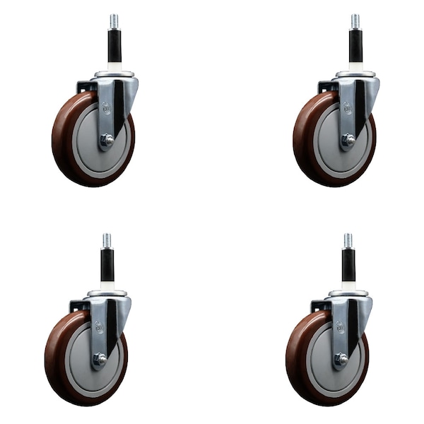 Listing is for a set of four 4 Service Caster Series #20 7/8'' expanding stem swivel casters with 5'' diameter by 1-1/4'' wide maroon polyurethane wheels capable of supporting a total weight of 1,400 lbs. 350 lbs./caster.. When searching for a reliable and durable solution to your caster needs, look no further than the Service Caster Series 20 expanding stem maroon polyurethane wheel casters. The Series #20 features an innovative expanding stem that can easily adapt to the inside diameter of the opening, allowing for a secure fit in round or square tubes. Simply tighten the topmost knurled nut to compress the rubber for a snug fit. For added security, further compress the rubber with a wrench via the nut under the swivel raceway. Finely crafted with a bright zinc plated finish, heat-treated ball bearing raceway, and a maroon polyurethane wheel, this versatile caster is ideal for work tables, shop projects, or any equipment with round or square tube legs. Service Caster is unsurpassed in quality, reliability, and excellent customer service. Count on us to move you forward.