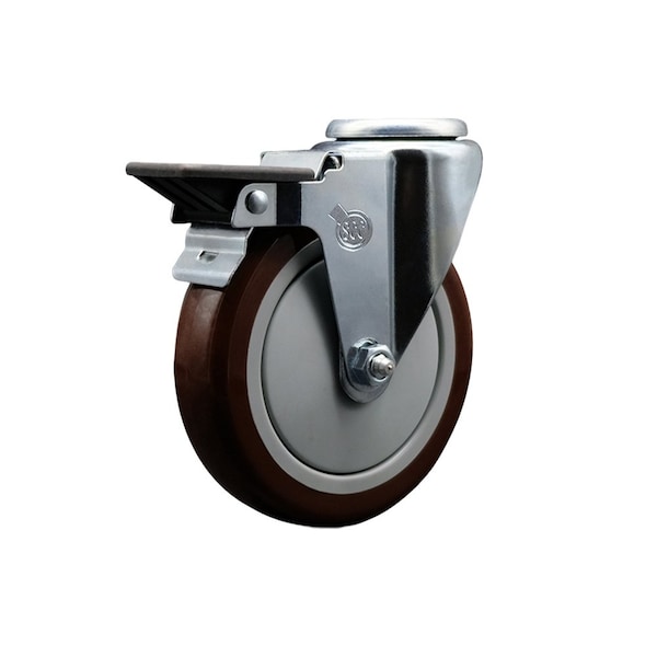 Listing is for one 1 Service Caster Series #20 swivel caster with a 5'' diameter by 1-1/4'' wide maroon polyurethane wheel and a bolt hole with posi lock brake capable of supporting 350 lbs./caster. When searching for a reliable and durable solution to your caster needs, consider Service Caster's Series 20 bolt hole polyurethane casters. The Service Caster Series #20 is ideal for light and medium duty material handling, carts, equipment, and shop projects. The bolt hole can accept a bolt or a customized stem, allowing for any type of mounting requirement.The zinc plated finish provides durability under any condition, while the non-marking, non-marring polyurethane wheels perform especially well on hard surfaces such as concrete, tile, and wood. All rolling on a finely crafted ball bearing design that will keep you moving forward. Service Caster is unsurpassed in quality, reliability, and excellent customer service. Count on us to move you forward.