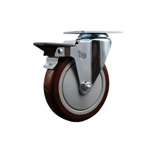 Listing is for one 1 Service Caster Series #20 swivel caster with a 5'' diameter by 1-1/4'' wide maroon polyurethane wheel and a posi locking brake capable of supporting 350 lbs./caster. When searching for a reliable and durable solution to your caster needs, look no further than the Service Caster Series 20 top plate polyurethane casters. The Service Caster Series #20 is ideal for light and medium duty material handling, carts, equipment, and shop projects. The zinc plated finish provides durability under any condition, while the non-marking, non-marring polyurethane wheels perform especially well on hard surfaces such as concrete, tile, and wood- rolling on a finely crafted ball bearing design that keeps you moving forward. Service Caster is unsurpassed in quality, reliability, and excellent customer service. Count on us to move you forward.