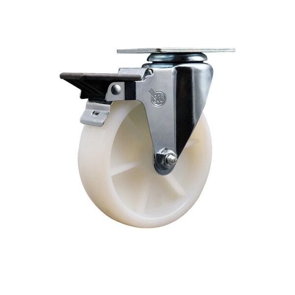 Listing is for one 1 Service Caster Series #20 swivel caster with a 5'' diameter by 1-1/4'' wide nylon wheel and a posi locking brake capable of supporting 300 lbs./caster. When searching for a reliable and durable solution to your caster needs, consider Service Caster Series 20 top plate nylon wheel casters. The Service Caster Series #20 is ideal for light and medium duty material handling, carts, equipment, and shop projects. The zinc plated finish provides durability under any condition, and the nylon wheels provide very low rolling resistance, show a high resistance to many aggressive substances, and are maintenance free under normal operating conditions. Not only are they resistant to most chemicals and oils, but they will be sure to keep you safely moving forward. Service Caster is unsurpassed in quality, reliability, and excellent customer service. Count on us to move you forward.