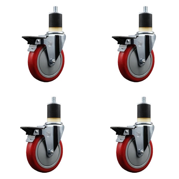 Listing is for a set of four 4 Service Caster Series #20 1-7/8'' expanding stem swivel casters with 5'' diameter by 1-1/4'' wide red polyurethane wheels and posi locking brakes capable of supporting a total weight of 1,400 lbs. 350 lbs./caster.. When searching for a reliable and durable solution to your caster needs, look no further than the Service Caster Series 20 expanding stem red polyurethane wheel casters. The Series #20 features an innovative expanding stem that can easily adapt to the inside diameter of the opening, allowing for a secure fit in round or square tubes. Simply tighten the topmost knurled nut to compress the rubber for a snug fit. For added security, further compress the rubber with a wrench via the nut under the swivel raceway. Finely crafted with a bright zinc plated finish, heat-treated ball bearing raceway, and a red polyurethane wheel, this versatile caster is ideal for work tables, shop projects, or any equipment with round or square tube legs. Service Caster is unsurpassed in quality, reliability, and excellent customer service. Count on us to move you forward.