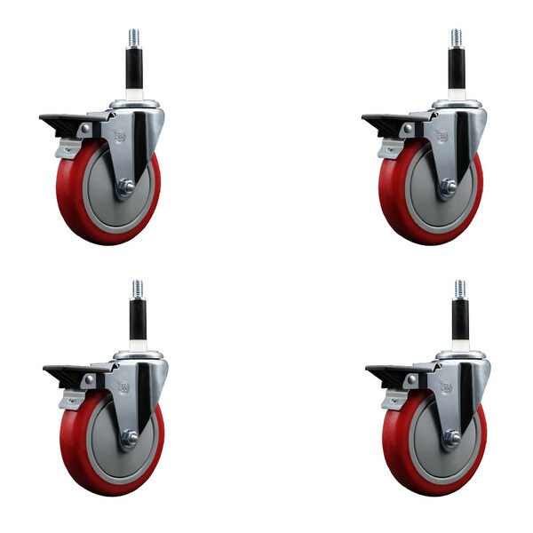 5'' Red Poly Swivel 7/8'' Expanding Stem Caster Set with Brake, 4PK