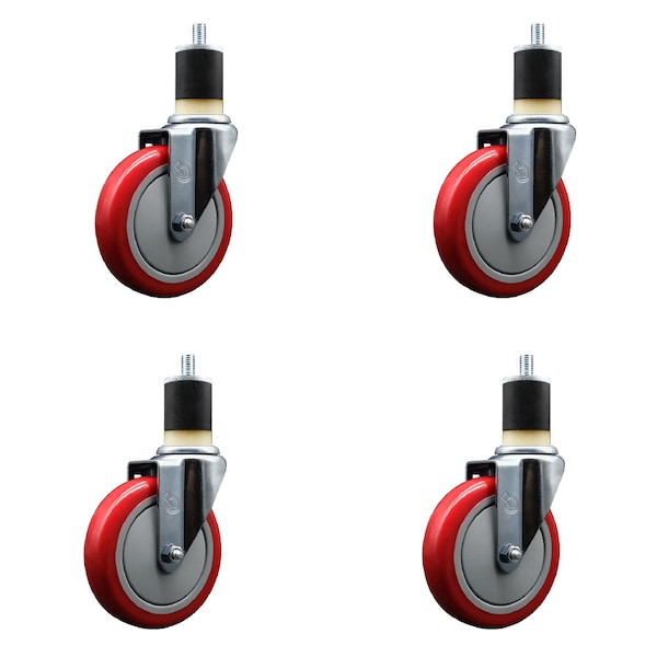 5'' Red Poly Wheel Swivel 1-7/8'' Expanding Stem Caster Set, 4PK