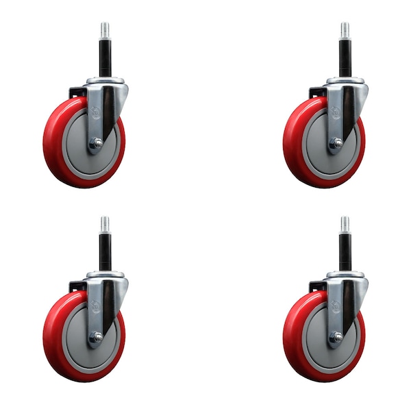 Listing is for a set of four 4 Service Caster Series #20 3/4'' expanding stem swivel casters with 5'' diameter by 1-1/4'' wide red polyurethane wheels capable of supporting a total weight of 1,400 lbs. 350 lbs./caster.. When searching for a reliable and durable solution to your caster needs, look no further than the Service Caster Series 20 expanding stem red polyurethane wheel casters. The Series #20 features an innovative expanding stem that can easily adapt to the inside diameter of the opening, allowing for a secure fit in round or square tubes. Simply tighten the topmost knurled nut to compress the rubber for a snug fit. For added security, further compress the rubber with a wrench via the nut under the swivel raceway. Finely crafted with a bright zinc plated finish, heat-treated ball bearing raceway, and a red polyurethane wheel, this versatile caster is ideal for work tables, shop projects, or any equipment with round or square tube legs. Service Caster is unsurpassed in quality, reliability, and excellent customer service. Count on us to move you forward.