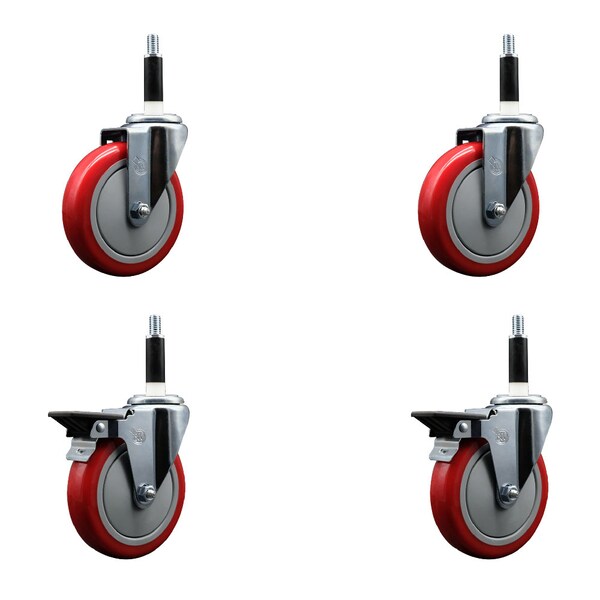 5'' Red Poly Wheel Swivel 7/8'' Expanding Stem Caster Set 2 Brakes, 4PK