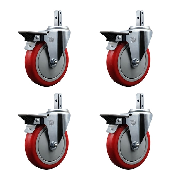 5'' Red Poly Wheel Swivel 7/8'' Square Stem Caster Set with Brake, 4PK
