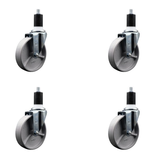 Listing is for a set of four 4 Service Caster Series #20 1-1/2'' expanding stem swivel casters with 5'' diameter by 1-1/4'' wide silver semi steel cast iron wheels capable of supporting a total weight of 1,200 lbs. 300 lbs./caster.. When searching for a reliable and durable solution to your caster needs, look no further than the Service Caster Series 20 expanding stem semi steel cast iron wheel casters. The Series #20 features an innovative expanding stem that can easily adapt to the inside diameter of the opening, allowing for a secure fit in round or square tubes. Simply tighten the topmost knurled nut to compress the rubber for a snug fit. For added security, further compress the rubber with a wrench via the nut under the swivel raceway. Finely crafted with a bright zinc plated finish, heat-treated ball bearing raceway, and a semi steel cast iron wheel, this versatile caster is ideal for work tables, shop projects, or any equipment with round or square tube legs. Service Caster is unsurpassed in quality, reliability, and excellent customer service. Count on us to move you forward.