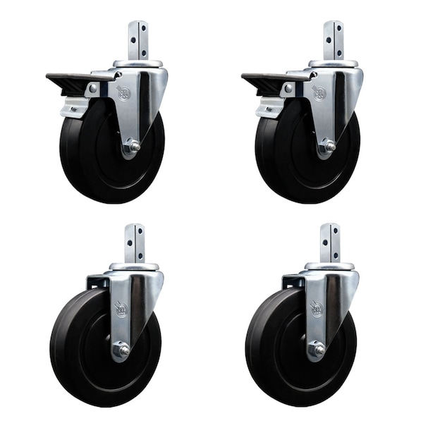 Listing is for four 4 Service Caster Series #20 swivel casters, two 2 swivel & 2 swivel with posi lock brakes, with a 5'' diameter by 1-1/4'' wide black soft rubber wheels and a 7/8'' square stem. Supports a total weight of 1,100lbs 275lbs/caster. When searching for a reliable and durable solution to your caster needs, consider Service Caster's Series 20 square stem soft rubber casters. The Service Caster Series 20 is ideal for light and medium duty material handling, carts, equipment, and shop projects. The zinc plated finish provides durability under any condition. The soft rubber wheels- resistant to most chemicals and oils- combine a soft tread on a hard rubber core, offering quiet movement and a cushioned ride. The square stems are designed to be bolted or riveted onto the inside of angled iron legs or against any flat surface. Service Caster is unsurpassed in quality, reliability, and excellent customer service. Count on us to move you forward.