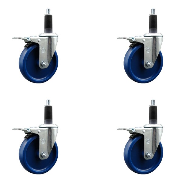 Listing is for a set of four 4 Service Caster Series #20 1-1/8'' expanding stem swivel casters with 5'' diameter by 1-1/4'' wide blue solid polyurethane wheels and total locking brakes capable of supporting a total weight of 1,200 lbs. 300 lbs./caster.. When searching for a reliable and durable solution to your caster needs, look no further than the Service Caster Series 20 expanding stem solid polyurethane wheel casters. The Series #20 features an innovative expanding stem that can easily adapt to the inside diameter of the opening, allowing for a secure fit in round or square tubes. Simply tighten the topmost knurled nut to compress the rubber for a snug fit. For added security, further compress the rubber with a wrench via the nut under the swivel raceway. Finely crafted with a bright zinc plated finish, heat-treated ball bearing raceway, and a solid polyurethane wheel, this versatile caster is ideal for work tables, shop projects, or any equipment with round or square tube legs. Service Caster is unsurpassed in quality, reliability, and excellent customer service. Count on us to move you forward.