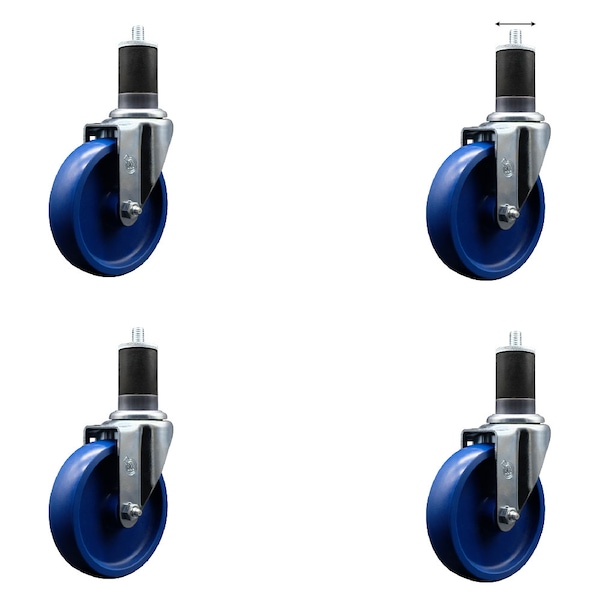 Listing is for a set of four 4 Service Caster Series #20 1-5/8'' expanding stem swivel casters with 5'' diameter by 1-1/4'' wide blue solid polyurethane wheels capable of supporting a total weight of 1,200 lbs. 300 lbs./caster.. When searching for a reliable and durable solution to your caster needs, look no further than the Service Caster Series 20 expanding stem solid polyurethane wheel casters. The Series #20 features an innovative expanding stem that can easily adapt to the inside diameter of the opening, allowing for a secure fit in round or square tubes. Simply tighten the topmost knurled nut to compress the rubber for a snug fit. For added security, further compress the rubber with a wrench via the nut under the swivel raceway. Finely crafted with a bright zinc plated finish, heat-treated ball bearing raceway, and a solid polyurethane wheel, this versatile caster is ideal for work tables, shop projects, or any equipment with round or square tube legs. Service Caster is unsurpassed in quality, reliability, and excellent customer service. Count on us to move you forward.