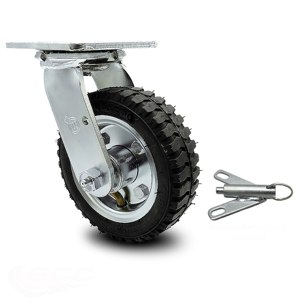 Listing is for one (1) Service Caster Series #100 swivel caster with a bolt on swivel lock with a 6” diameter by 2” wide black pneumatic rubber wheel. Supports up to 250lbs per caster.When searching for a reliable and durable solution to your caster needs, look no further than the Service Caster Series #100 casters. The universal design provides an excellent OEM and replacement part for luggage carts, food carts, or any application your business requires. With it’s zinc plated finish and pneumatic rubber wheels all rolling on finely crafted ball bearings, the Service Caster Series #100 provides enhanced noise reduction and consistent roll on any surface, for an overall superior ride under any condition. Note: this caster is NOT intended for highway use! Manual speed only.