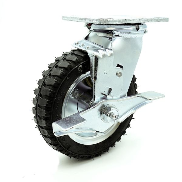 Listing is for one (1) Service Caster Series #100 swivel caster with a 6” diameter by 2” wide black pneumatic rubber wheel fitted with a top locking brake. Supports up to 250lbs per caster.When searching for a reliable and durable solution to your caster needs, look no further than the Service Caster Series #100 casters. The universal design provides an excellent OEM and replacement part for luggage carts, food carts, or any application your business requires. With it’s zinc plated finish and pneumatic rubber wheels all rolling on finely crafted ball bearings, the Service Caster Series #100 provides enhanced noise reduction and consistent roll on any surface, for an overall superior ride under any condition. Note: this caster is NOT intended for highway use! Manual speed only.