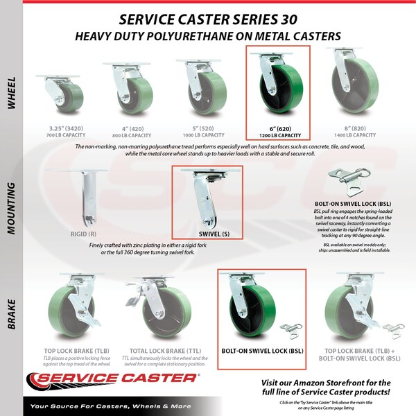 Listing is for a set of four (4) Service Caster Series #30 swivel casters with 6" diameter by 2" wide green polyurethane on cast iron wheels with bolt on swivel locks capable of supporting a total weight of 4,600 lbs. (1,200 lbs. per caster). When searching for a reliable and durable solution for medium and heavy duty projects, consider Service Caster’s Series 30 top plate polyurethane casters. The Service Caster Series #30 is ideal for material handling, carts, equipment, and shop projects. The non-marking, non-marring polyurethane tread performs especially well on hard surfaces such as concrete, tile, and wood, while the metal core wheel stands up to heavier loads with a stable and secure roll. Finely crafted with double ball bearing heat treated raceways, these versatile casters are ideal for a wide range of applications, such as dollies, platform trucks, warehouse carts and freight terminals. Or ensure a smooth and secure ride for food service carts, hotel housekeeping carts, and industrial and commercial equipment. Even drywall carts, welding carts, and wall panel carts will be ready to roll on the Series 30, keeping you moving forward. Service Caster is unsurpassed in quality, reliability, and excellent customer service. Count on us to move you forward.