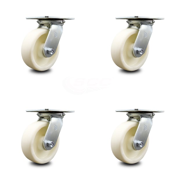 Listing is for a set of four (4) Service Caster Series #35 swivel casters with 6" diameter by 2" wide nylon wheels capable of supporting a total weight of 5,000 lbs. (1,250 lbs. per caster). When searching for a reliable and durable heavy duty solution to your caster needs, consider Service Caster’s Series 35 nylon wheel casters. The Service Caster Series #35 is ideal for medium and heavy duty material handling, carts, equipment, and shop projects. The zinc plated finish provides durability under any condition and the nylon wheels provide very low rolling resistance, show a high resistance to many aggressive substances and under normal operating conditions are maintenance free. Resistant to most chemical and oils, these nylon wheels will keep you safely moving forward. Service Caster is unsurpassed in quality, reliability, and excellent customer service. Count on us to move you forward.