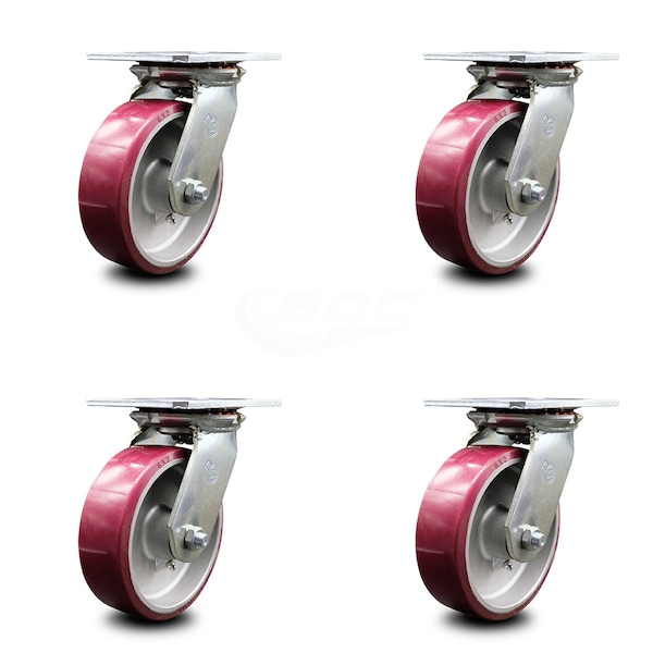 Listing is for a set of four (4) Service Caster Series #35 swivel casters with 6" diameter by 2" wide polyurethane on aluminum wheels and maintenance free precision ball wheel bearings. Capable of supporting a total weight of 4,800 lbs. (1,200 lbs. per caster). When searching for a reliable and durable solution to your caster needs, rely on Service Caster Series 35 polyurethane aluminum wheel casters. The Series #35 features heavy duty polyurethane wheels that are chemically bonded to an aluminum core, providing a smooth roll over uneven surfaces without marking or marring floors. Finely crafted with a bright zinc plated finish and heat-treated ball bearing raceway, these versatile casters are ideal for a wide range of applications. Use on dollies, platform trucks, warehouse carts and freight terminals, or ensure a smooth and secure ride for food service carts, hotel housekeeping carts, and industrial and commercial equipment. Even drywall carts, welding carts, and wall panel carts will be ready to roll on the Series 35, keeping you moving forward.