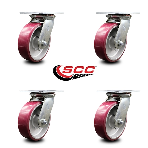 Listing is for a set of four (4) Service Caster Series #35 swivel casters with 6" diameter by 2" wide polyurethane on aluminum wheels capable of supporting a total weight of 4,800 lbs. (1,200 lbs. per caster). When searching for a reliable and durable solution to your caster needs, rely on Service Caster Series 35 polyurethane aluminum wheel casters. The Series #35 features heavy duty polyurethane wheels that are chemically bonded to an aluminum core, providing a smooth roll over uneven surfaces without marking or marring floors. Finely crafted with a bright zinc plated finish and heat-treated ball bearing raceway, these versatile casters are ideal for a wide range of applications. Use on dollies, platform trucks, warehouse carts and freight terminals, or ensure a smooth and secure ride for food service carts, hotel housekeeping carts, and industrial and commercial equipment. Even drywall carts, welding carts, and wall panel carts will be ready to roll on the Series 35, keeping you moving forward.