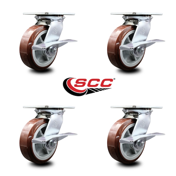 6 Inch Heavy Duty Polyurethane Caster Set with Roller Bearings and Brakes SCC