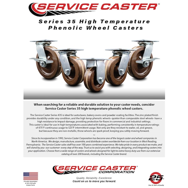 Listing is for one (1) Service Caster Series #35 rigid caster with a 6" diameter by 2" wide glass filled high temperature phenolic wheel capable of supporting 1200 lbs./caster. When searching for a reliable and durable solution to your caster needs, consider Service Caster Series 35 high temperature phenolic wheel casters. The Service Caster Series #35 is ideal for autoclaves, bakery ovens and powder coating facilities. The zinc plated finish provides durability under any condition, and the high temp phenolic wheels- quieter than comparable steel wheels- have a high resistance to impact damage, providing protection for floors in commercial and industrial settings. This caster is ideal for use in high temperatures associated with baking, performing consistently in temperature ratings of 475°F continuous usage to 525°F intermittent usage. Not only are they resistant to water, oil, and grease, but because they are non-metallic, these wheels are spark proof, keeping you safely moving forward.