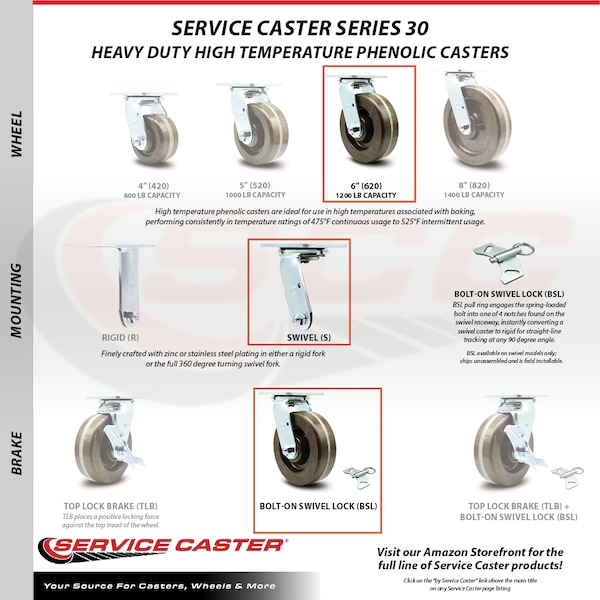 Listing is for a set of four (4) Service Caster Series #30 casters, two (2) swivel casters with bolt on swivel locks and two (2) swivel casters with side lock brakes, with 6" diameter by 2" wide high temperature phenolic wheels capable of supporting a total weight of 4,800 lbs. (1,200 lbs./caster).When searching for a reliable and durable solution to your caster needs, consider Service Caster Series 30 high temperature phenolic wheel casters. The Service Caster Series #30 is ideal for autoclaves, bakery ovens and powder coating facilities. The zinc plated finish provides durability under any condition, and the high temp phenolic wheels- quieter than comparable steel wheels- have a high resistance to impact damage, providing protection for floors in commercial and industrial settings. This caster is ideal for use in high temperatures associated with baking, performing consistently in temperature ratings of 475°F continuous usage to 525°F intermittent usage. Not only are they resistant to water, oil, and grease, but because they are non-metallic, these wheels are spark proof, keeping you safely moving forward. Service Caster is unsurpassed in quality, reliability, and excellent customer service. Count on us to move you forward.