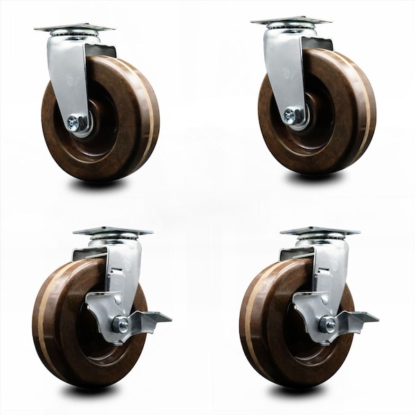 6 Inch High Temp Phenolic Swivel Caster Set with Roller Bearings 2 Brakes SCC