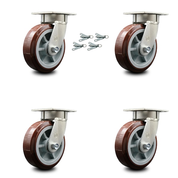 Listing is for a set of four (4) Service Caster Series #KP30 swivel casters with 6" diameter by 2" wide polyurethane on polyolefin wheels with bolt on swivel locks capable of supporting a total weight of 3,600 lbs. (900 lbs. per caster). When searching for a reliable and durable solution to your caster needs, consider Service Caster Series KP30 polyurethane wheel casters. The Service Caster Series KP30 features heavy duty non-marking polyurethane tread on a polyolefin core wheel, providing a smooth roll over uneven surfaces without marking or marring floors. Featuring a Kingpinless hot forged ASTM1045 steel design that increases caster durability and integrity, the series KP30 eliminates problems associated with kingpin failure due to severe shock loading. In addition, the Kingpinless design features 3/8” diameter HRC45 steel ball bearings which absorb thrust and load in severe environments. Lastly, Service Caster’s Series KP30 casters are finely crafted with grease fittings, and 4 position notches to accept 4-position locks. These highly versatile casters are ideal for a wide range of applications, such as dollies, platform trucks, warehouse carts and freight terminals. Even drywall carts, welding carts, and wall panel carts will be ready to roll on the Series KP30, keeping you moving forward.