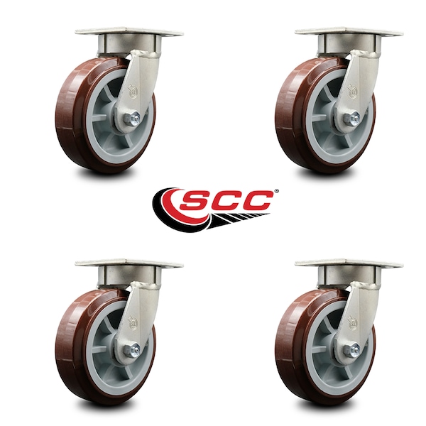 Listing is for a set of four (4) Service Caster Series #KP30 swivel casters with 6" diameter by 2" wide polyurethane on polyolefin wheels capable of supporting a total weight of 3,600 lbs. (900 lbs. per caster). When searching for a reliable and durable solution to your caster needs, consider Service Caster Series KP30 polyurethane wheel casters. The Service Caster Series KP30 features heavy duty non-marking polyurethane tread on a polyolefin core wheel, providing a smooth roll over uneven surfaces without marking or marring floors. Featuring a Kingpinless hot forged ASTM1045 steel design that increases caster durability and integrity, the series KP30 eliminates problems associated with kingpin failure due to severe shock loading. In addition, the Kingpinless design features 3/8” diameter HRC45 steel ball bearings which absorb thrust and load in severe environments. Lastly, Service Caster’s Series KP30 casters are finely crafted with grease fittings, and 4 position notches to accept 4-position locks. These highly versatile casters are ideal for a wide range of applications, such as dollies, platform trucks, warehouse carts and freight terminals. Even drywall carts, welding carts, and wall panel carts will be ready to roll on the Series KP30, keeping you moving forward.