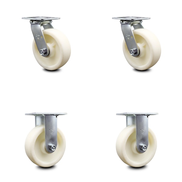 Listing is for a set of four (4) Service Caster Series #30 casters, two (2) swivel and two (2) rigid casters, with 6" diameter by 2" wide nylon wheels capable of supporting a total weight of 5,000 lbs. (1,250 lbs./caster).When searching for a reliable and durable heavy duty solution to your caster needs, consider Service Caster’s Series 30 nylon wheel casters.The Service Caster Series #30 is ideal for medium and heavy duty material handling, carts, equipment, and shop projects. The zinc plated finish provides durability under any condition and the nylon wheels provide very low rolling resistance, show a high resistance to many aggressive substances and under normal operating conditions are maintenance free. Resistant to most chemical and oils, these nylon wheels will keep you safely moving forward. Service Caster is unsurpassed in quality, reliability, and excellent customer service. Count on us to move you forward.