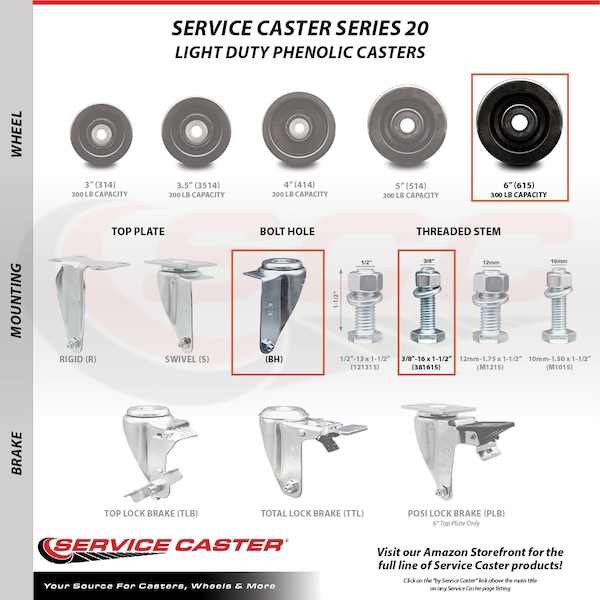 Listing is for a set of four (4) Service Caster Series #20 swivel casters, four (4) swivel 3/8" threaded stem casters with 6” diameter by 1-1/2” wide phenolic wheels. Supports a total weight of 1,200lbs (300lbs/per caster). When searching for a reliable and durable solution to your caster needs, look no further than the Service Caster Series 20 top plate phenolic casters.