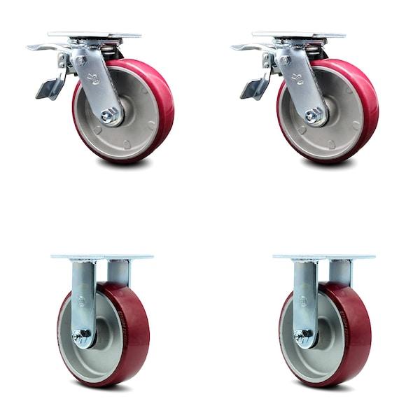Listing is for a set of four (4) Service Caster Series #30 casters, two (2) swivel with total lock brakes and two (2) rigid casters, with 6" diameter by 2" wide polyurethane on aluminum wheels capable of supporting a total weight of 4,800 lbs. (1,200 lbs./caster).When searching for a reliable and durable solution to your caster needs, rely on Service Caster Series 30 polyurethane aluminum wheel casters. The Series #30 features heavy duty polyurethane wheels that are chemically bonded to an aluminum core, providing a smooth roll over uneven surfaces without marking or marring floors. Finely crafted with a bright zinc plated finish and heat-treated ball bearing raceway, these versatile casters are ideal for a wide range of applications. Use on dollies, platform trucks, warehouse carts and freight terminals, or ensure a smooth and secure ride for food service carts, hotel housekeeping carts, and industrial and commercial equipment. Even drywall carts, welding carts, and wall panel carts will be ready to roll on the Series 30, keeping you moving forward. Service Caster is unsurpassed in quality, reliability, and excellent customer service. Count on us to move you forward.