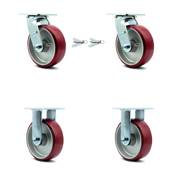Listing is for a set of four (4) Service Caster Series #30 casters, two (2) swivel casters with bolt on swivel locks and two (2) rigid casters, with 6" diameter by 2" wide polyurethane on aluminum wheels capable of supporting a total weight of 4,800 lbs. (1,200 lbs./caster).When searching for a reliable and durable solution to your caster needs, rely on Service Caster Series 30 polyurethane aluminum wheel casters. The Series #30 features heavy duty polyurethane wheels that are chemically bonded to an aluminum core, providing a smooth roll over uneven surfaces without marking or marring floors. Finely crafted with a bright zinc plated finish and heat-treated ball bearing raceway, these versatile casters are ideal for a wide range of applications. Use on dollies, platform trucks, warehouse carts and freight terminals, or ensure a smooth and secure ride for food service carts, hotel housekeeping carts, and industrial and commercial equipment. Even drywall carts, welding carts, and wall panel carts will be ready to roll on the Series 30, keeping you moving forward. Service Caster is unsurpassed in quality, reliability, and excellent customer service. Count on us to move you forward.