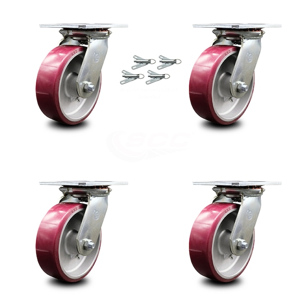 Listing is for a set of four (4) Service Caster Series #35 swivel casters with 6" diameter by 2" wide polyurethane on aluminum wheels with bolt on swivel locks capable of supporting a total weight of 4,800 lbs. (1,200 lbs. per caster). When searching for a reliable and durable solution to your caster needs, rely on Service Caster Series 35 polyurethane aluminum wheel casters. The Series #35 features heavy duty polyurethane wheels that are chemically bonded to an aluminum core, providing a smooth roll over uneven surfaces without marking or marring floors. Finely crafted with a bright zinc plated finish and heat-treated ball bearing raceway, these versatile casters are ideal for a wide range of applications. Use on dollies, platform trucks, warehouse carts and freight terminals, or ensure a smooth and secure ride for food service carts, hotel housekeeping carts, and industrial and commercial equipment. Even drywall carts, welding carts, and wall panel carts will be ready to roll on the Series 35, keeping you moving forward.