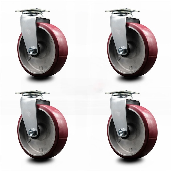 Listing is for a set of four (4) Service Caster Series #20 swivel casters, four (4) swivel casters with 6” diameter by 2" wide polyurethane on aluminum wheel and maintenance free precision ball wheel bearings. Supports a total weight of 1,800lbs (450lbs/per caster). When searching for a reliable and durable solution to your caster needs, rely on Service Caster Series 20 polyurethane aluminum wheel casters. The Series #20 features heavy duty polyurethane wheels that are chemically bonded to an aluminum core, providing a smooth roll over uneven surfaces without marking or marring floors. Finely crafted with a bright zinc plated finish and heat-treated ball bearing raceway, these versatile casters are ideal for a wide range of applications. Use on dollies, platform trucks, warehouse carts and freight terminals, or ensure a smooth and secure ride for food service carts, hotel housekeeping carts, and industrial and commercial equipment. Even drywall carts, welding carts, and wall panel carts will be ready to roll on the Series 20, keeping you moving forward. Service Caster is unsurpassed in quality, reliability, and excellent customer service. Count on us to move you forward.
