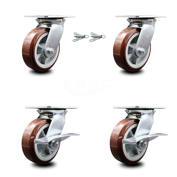 Listing is for a set of four (4) Service Caster Series #35 casters, two (2) swivel casters with bolt on swivel locks and two (2) swivel casters with side lock brakes, with 6" diameter by 2" wide polyurethane on polyolefin wheels capable of supporting a total weight of 3,600 lbs. (900 lbs./caster). When searching for a reliable and durable solution to your caster needs, consider Service Caster Series 35 polyurethane wheel casters. The Service Caster Series #35 features heavy duty non-marking polyurethane tread on a polyolefin core wheel, providing a smooth roll over uneven surfaces without marking or marring floors. These versatile casters are ideal for a wide range of applications, such as dollies, platform trucks, warehouse carts and freight terminals. Or ensure a smooth and secure ride for food service carts, hotel housekeeping carts, and industrial and commercial equipment. Even drywall carts, welding carts, and wall panel carts will be ready to roll on the Series 35, keeping you moving forward.