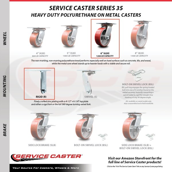 Listing is for a set of four (4) Service Caster Series #35 casters, two (2) swivel and two (2) rigid casters, with 6" diameter by 2" wide polyurethane on cast iron wheels and maintenance free precision ball wheel bearings. Capable of supporting a total weight of 4,800 lbs. (1,200 lbs./caster). When searching for a reliable and durable solution for medium and heavy duty projects, consider Service Caster’s Series 35 polyurethane on metal wheel casters. The Service Caster Series #35 is ideal for material handling, carts, equipment, and shop projects. The non-marking, non-marring polyurethane tread performs especially well on hard surfaces such as concrete, tile, and wood, while the metal core wheel stands up to heavier loads with a stable and secure roll. Finely crafted with double ball bearing heat treated raceways, these versatile casters are ideal for a wide range of applications, such as dollies, platform trucks, warehouse carts and freight terminals. Or ensure a smooth and secure ride for food service carts, hotel housekeeping carts, and industrial and commercial equipment. Even drywall carts, welding carts, and wall panel carts will be ready to roll on the Series 35, keeping you moving forward.