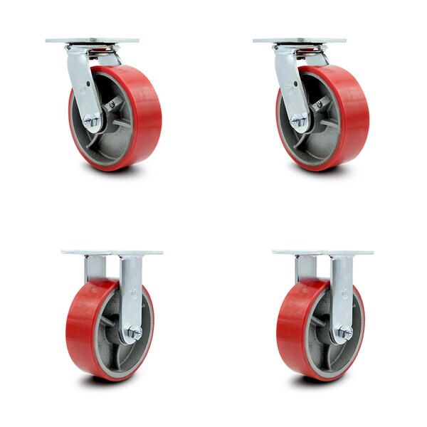 Listing is for a set of four (4) Service Caster Series #30 casters with a 6" diameter, 2" wide red polyurethane tread set on metal core wheels. Set includes two (2) swivel casters and two (2) rigid casters. Supports 4800 total pounds (lbs) at 1200 pounds (lbs) per caster. Non Marking/Non Marring.When searching for a reliable and durable solution for medium and heavy duty projects, consider Service Caster’s Series 30 top plate polyurethane casters. The Service Caster Series #30 is ideal for material handling, carts, equipment, and shop projects. The non-marking, non-marring polyurethane tread performs especially well on hard surfaces such as concrete, tile, and wood, while the metal core wheel stands up to heavier loads with a stable and secure roll. Finely crafted with double ball bearing heat treated raceways, these versatile casters are ideal for a wide range of applications, such as dollies, platform trucks, warehouse carts and freight terminals. Or ensure a smooth and secure ride for food service carts, hotel housekeeping carts, and industrial and commercial equipment. Even drywall carts, welding carts, and wall panel carts will be ready to roll on the Series 30, keeping you moving forward. Service Caster is unsurpassed in quality, reliability, and excellent customer service. Count on us to move you forward.