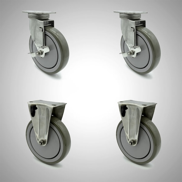 6 Inch SS Gray Polyurethane Top Plate Caster Set with 2 Brake 2 Rigid SCC