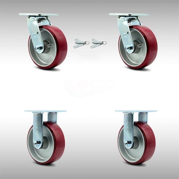 Listing is for a set of four (4) Service Caster Series #30 stainless steel casters, two (2) swivel casters with bolt on swivel locks and two (2) rigid casters, with 6" diameter by 2" wide polyurethane on aluminum wheels capable of supporting a total weight of 4,700 lbs. (1,200 lbs./caster).When searching for a reliable and durable solution to your caster needs, rely on Service Caster Series 30 stainless steel polyurethane aluminum casters. The Series #30 features heavy duty polyurethane wheels that are chemically bonded to an aluminum core, providing a smooth roll over uneven surfaces without marking or marring floors. Finely crafted with a heat-treated ball bearing raceway, these versatile casters are ideal for a wide range of applications. Use on dollies, platform trucks, warehouse carts and freight terminals, or ensure a smooth and secure ride for food service carts, hotel housekeeping carts, and industrial and commercial equipment. In contrast to the zinc plated caster, the luxuriously polished stainless steel finish resists rust and corrosion in indoor or outdoor applications where moisture is a factor. Service Caster is unsurpassed in quality, reliability, and excellent customer service. Count on us to move you forward.