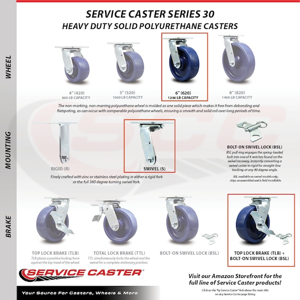 Listing is for a set of four (4) Service Caster Series #30 stainless steel swivel casters with 6" diameter by 2" wide solid polyurethane wheel and maintenance free precision ball wheel bearings with top lock brakes and bolt on swivel locks capable of supporting a total weight of 4,800 lbs. (1,200 lbs. per caster). When searching for a reliable and durable solution to your caster needs, consider Service Caster's Series 30 stainless steel solid polyurethane wheel casters. The Service Caster Series #30 features a non-marking, non-marring polyurethane wheel. Molded as one solid piece, this wheel is free from debonding, and will not flatspot, as can occur with comparable polyurethane wheels, ensuring a smooth and solid roll over long periods of time. These versatile casters are ideal for a wide range of applications, such as dollies, platform trucks, warehouse carts and freight terminals. Or ensure a secure ride for food service carts, hotel housekeeping carts, and industrial and commercial equipment. Even drywall carts, welding carts, and wall panel carts will be ready to roll on the Series 30, keeping you moving forward. In contrast to the zinc plated caster, the luxuriously polished stainless steel finish resists rust and corrosion in indoor or outdoor applications where moisture is a factor. Service Caster is unsurpassed in quality, reliability, and excellent customer service. Count on us to move you forward.