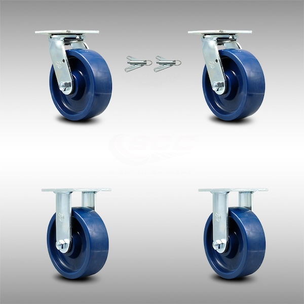 Listing is for a set of four (4) Service Caster Series #30 stainless steel casters, two (2) swivel casters with bolt on swivel locks and two (2) rigid casters, with 6" diameter by 2" wide solid polyurethane wheels capable of supporting a total weight of 4,700 lbs. (1,200 lbs./caster).When searching for a reliable and durable solution to your caster needs, consider Service Caster's Series 30 stainless steel solid polyurethane wheel casters. The Service Caster Series #30 features a non-marking, non-marring polyurethane wheel. Molded as one solid piece, this wheel is free from debonding, and will not flatspot, as can occur with comparable polyurethane wheels, ensuring a smooth and solid roll over long periods of time. These versatile casters are ideal for a wide range of applications, such as dollies, platform trucks, warehouse carts and freight terminals. Or ensure a secure ride for food service carts, hotel housekeeping carts, and industrial and commercial equipment. Even drywall carts, welding carts, and wall panel carts will be ready to roll on the Series 30, keeping you moving forward. In contrast to the zinc plated caster, the luxuriously polished stainless steel finish resists rust and corrosion in indoor or outdoor applications where moisture is a factor. Service Caster is unsurpassed in quality, reliability, and excellent customer service. Count on us to move you forward.