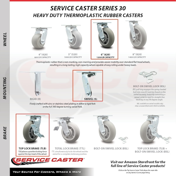 Listing is for a set of four (4) Service Caster Series #30 stainless steel swivel casters, two (2) with side locking brakes, with 6" diameter by 2" wide thermoplastic rubber donut tread on polyolefin core wheels capable of supporting a total weight of 2,000 lbs. (500 lbs./caster).When searching for a reliable and durable solution for medium and heavy duty projects, consider Service Caster’s Series 30 stainless steel thermoplastic rubber donut tread on polyolefin core casters. The rounded face "donut" style soft tread is made of thermoplastic rubber that is non-marking, non-marring and provides easier mobility over standard flat tread wheels, resulting in a long lasting, high capacity wheel capable of easy rolling under heavy loads. Finely crafted with double ball bearing heat treated raceways, these versatile casters are ideal for a wide range of applications, such as dollies, platform trucks, warehouse carts and freight terminals. Or ensure a smooth and secure ride for food service carts, hotel housekeeping carts, and industrial and commercial equipment. Even drywall carts, welding carts, and wall panel carts will be ready to roll on the Series 30, keeping you moving forward. In contrast to the zinc plated caster, the luxuriously polished stainless steel finish resists rust and corrosion in indoor or outdoor applications where moisture is a factor. Service Caster is unsurpassed in quality, reliability, and excellent customer service. Count on us to move you forward.