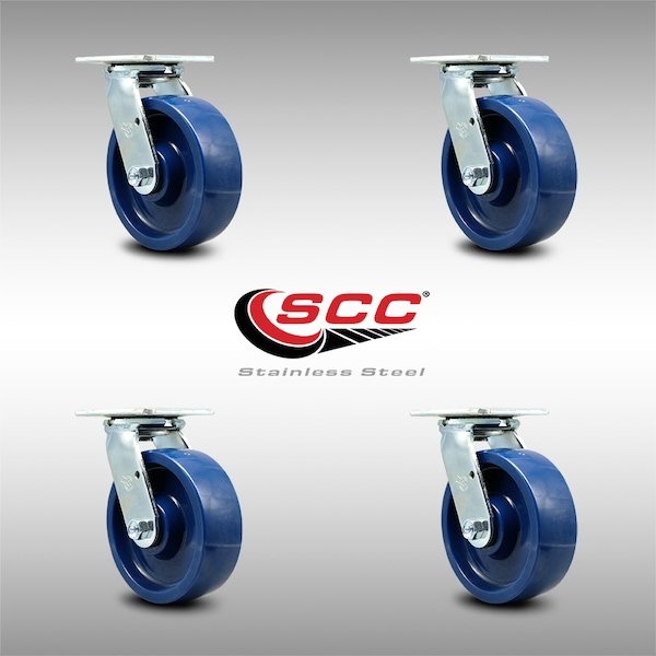 Listing is for a set of four (4) Service Caster Series #30 stainless steel swivel casters with 6" diameter by 2" wide solid polyurethane wheels capable of supporting a total weight of 4,800 lbs. (1,200 lbs. per caster). When searching for a reliable and durable solution to your caster needs, consider Service Caster's Series 30 stainless steel solid polyurethane wheel casters. The Service Caster Series #30 features a non-marking, non-marring polyurethane wheel. Molded as one solid piece, this wheel is free from debonding, and will not flatspot, as can occur with comparable polyurethane wheels, ensuring a smooth and solid roll over long periods of time. These versatile casters are ideal for a wide range of applications, such as dollies, platform trucks, warehouse carts and freight terminals. Or ensure a secure ride for food service carts, hotel housekeeping carts, and industrial and commercial equipment. Even drywall carts, welding carts, and wall panel carts will be ready to roll on the Series 30, keeping you moving forward. In contrast to the zinc plated caster, the luxuriously polished stainless steel finish resists rust and corrosion in indoor or outdoor applications where moisture is a factor. Service Caster is unsurpassed in quality, reliability, and excellent customer service. Count on us to move you forward.