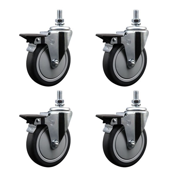 Listing is for a set of four 4 Service Caster Series 20 swivel casters, four 4 swivel 10MM threaded stem casters with posi lock brakes, 6 diameter by 114 wide thermoplastic rubber wheels Supports a total weight of 1,200lbs 300lbsper caster When searching for a reliable and durable solution to your caster needs, consider Service Casters 316 stainless steel thermoplastic rubber casters SS316 casters are ideal for light and medium duty material handling, carts, equipment, and shop projects Built withv316 stainless steel, which contains additional molybdenum and nickel content, making it more corrosion resistant than standard 304 stainless steel The soft, quiet and nonmarking thermoplastic rubber wheels perform especially well on hard surfaces such as concrete, tile, and wood They are resistant to water, oil, and grease and will keep you safely moving forward Mounting options include top plate, bolt hole, expanding stem and standard and metric threaded stem sizes