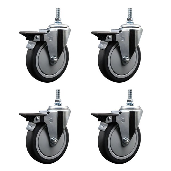 Listing is for a set of four 4 Service Caster Series 20 swivel casters, four 4 swivel 12MM threaded stem casters with posi lock brakes, 6 diameter by 114 wide thermoplastic rubber wheels Supports a total weight of 1,200lbs 300lbsper caster When searching for a reliable and durable solution to your caster needs, consider Service Casters 316 stainless steel thermoplastic rubber casters SS316 casters are ideal for light and medium duty material handling, carts, equipment, and shop projects Built withv316 stainless steel, which contains additional molybdenum and nickel content, making it more corrosion resistant than standard 304 stainless steel The soft, quiet and nonmarking thermoplastic rubber wheels perform especially well on hard surfaces such as concrete, tile, and wood They are resistant to water, oil, and grease and will keep you safely moving forward Mounting options include top plate, bolt hole, expanding stem and standard and metric threaded stem sizes
