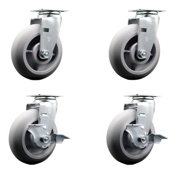 6 Inch Thermoplastic Rubber Swivel Caster Set with Roller Bearings 2 Brakes