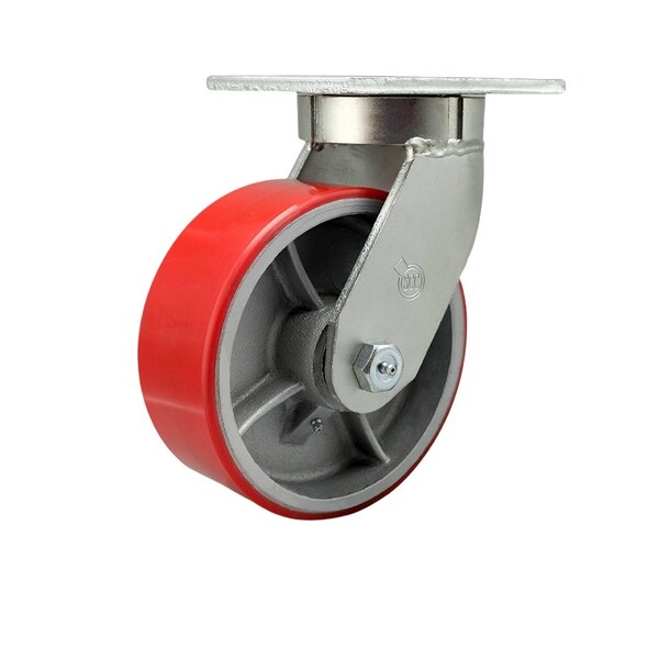 Listing is for one 1 Service Caster Series #92 swivel caster with a 8'' diameter, 3'' wide red polyurethane tread on metal core wheel. Supports 2500 pounds lbs per caster. When searching for a reliable and durable solution for extra heavy duty projects, consider Service Caster's Series 92 top plate polyurethane on metal wheel casters. The Service Caster Series #92 is ideal for cranes, gantry, hoists, winches, material handling, carts and industrial equipment. The non-marking, non-marring polyurethane tread performs especially well on hard surfaces such as concrete, tile, and wood, while the metal core wheel stands up to heavier loads with a stable and secure roll. Featuring a Kingpinless hot forged ASTM1045 steel design that increases caster durability and integrity, the series 92 eliminates problems associated with kingpin failure due to severe shock loading. In addition, the Kingpinless design features 1/2'' diameter HRC45 steel ball bearings which absorb thrust and load in severe environments. Lastly, Service Caster's Series #92 top plate casters are finely crafted with zinc plating, grease fittings, and 4 position notches to accept 4-position locks. These highly versatile casters are ideal for a wide range of applications, such as dollies, platform trucks, warehouse carts and freight terminals. Even drywall carts, welding carts, and wall panel carts will be ready to roll on the Series 92, keeping you moving forward.Service Caster is unsurpassed in quality, reliability, and excellent customer service. Count on us to move you forward.