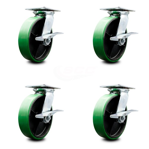 8 Inch Green Poly on Cast Iron Caster Set with Roller Bearing and Brake SCC